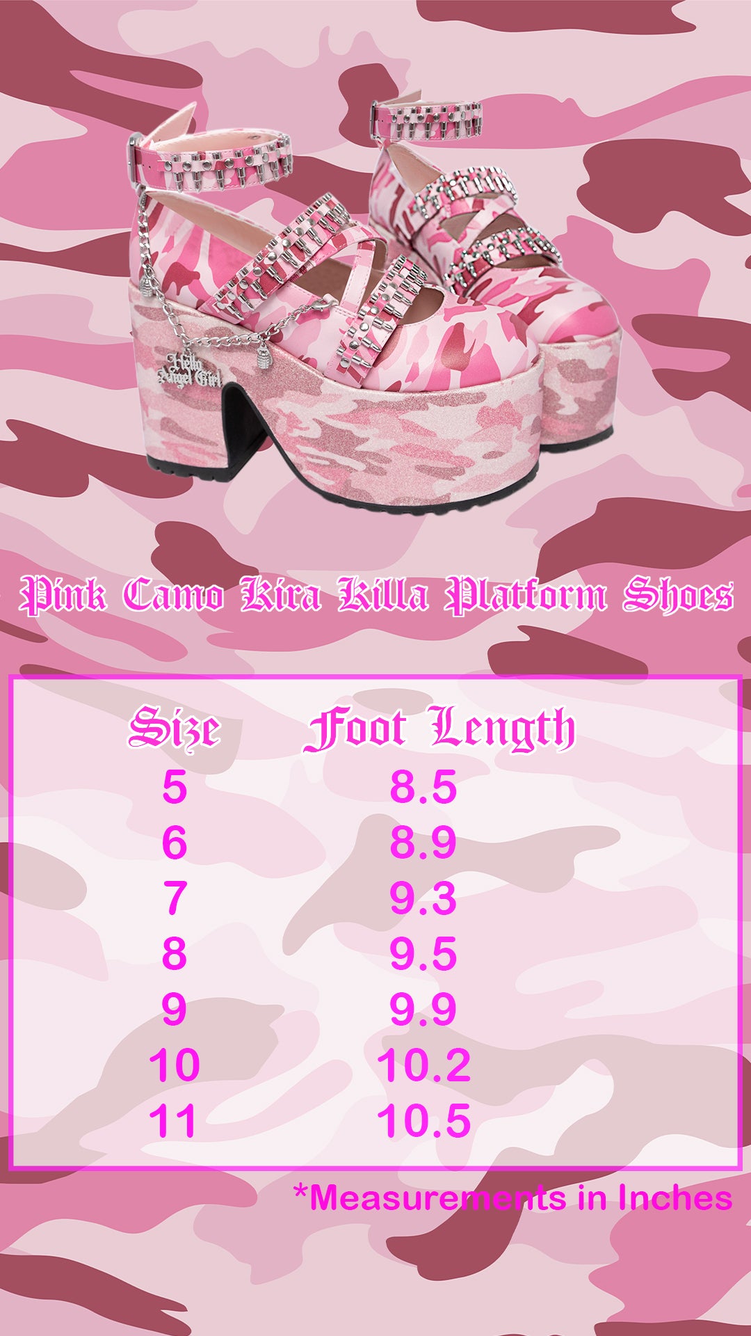 Each Camo Kira Killa Platform Shoes has 3 bullet shoe straps (comes with extra bullets), are printed in original Hello Angel Girl camouflage art, adorned with a Hello Angel Girl Grenade Charm Chain Link, and decorated with a glitter camouflage platform sole.Â